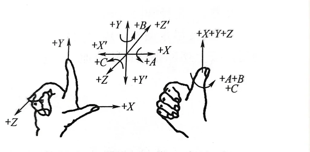 - Following the right-hand rule: X, Y, and Z represent the basic coordinate axes. The middle finger corresponds to the Z-axis, the thumb to the X-axis, and the index finger to the Y-axis. Circular feed axes rotating around the X, Y, and Z axes are denoted by A, B, and C. According to the right-hand screw rule, when the thumb points toward the +X, +Y, and +Z directions, the direction in which the four fingers bend corresponds to the +A, +B, and +C directions of circular feed motion, as shown in Figure 3.