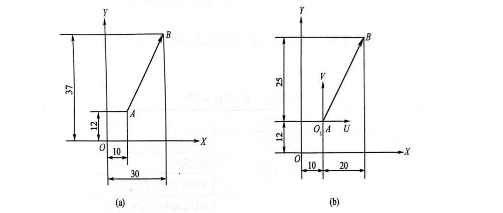 - Relative coordinate programming means coordinate values are given relative to the previous position. During calculation, the coordinates of the current point are determined by the difference between the coordinates of the next point and the previous point. Typically, X, Y, Z represent absolute coordinates, while U, V, W represent relative coordinates. Within the same program segment, X and U, or Y and V, or Z and W can be used interchangeably. In CNC milling programming, G90 X_Y_Z_ denotes absolute coordinates, while G91 X_Y_Z_ denotes relative coordinates. As shown in the figure, the absolute programming code for (a) is: G90 G00 X30 Y37; the relative programming code for (b) is: G91 G00 X20 Y25.