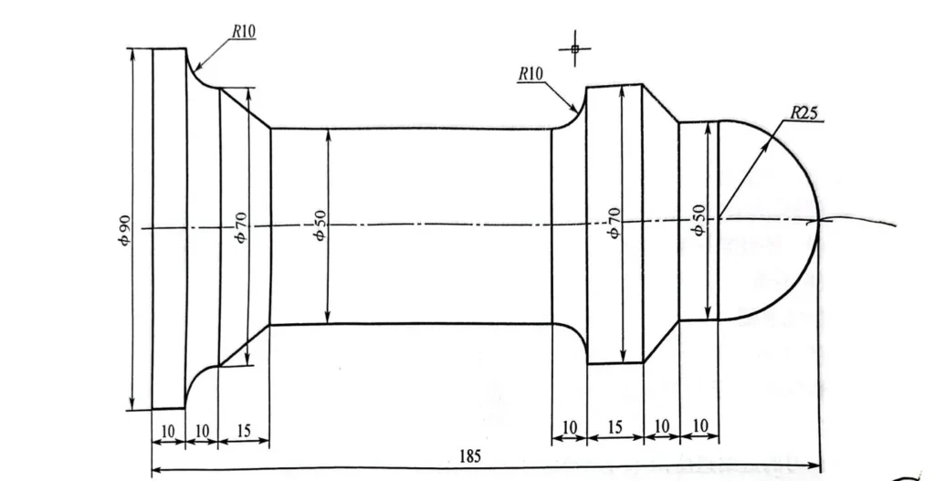 Next, we’ll guide you through writing a machining program for a part. Assuming a blank diameter of 100 mm bar stock, roughing allowances are: U+=0.5, W+=0, and cycle count R=25. The maximum removal in the X-axis is U=(100-0-0.5)/2=49.75, while the maximum removal in the Z-axis is W=0.
